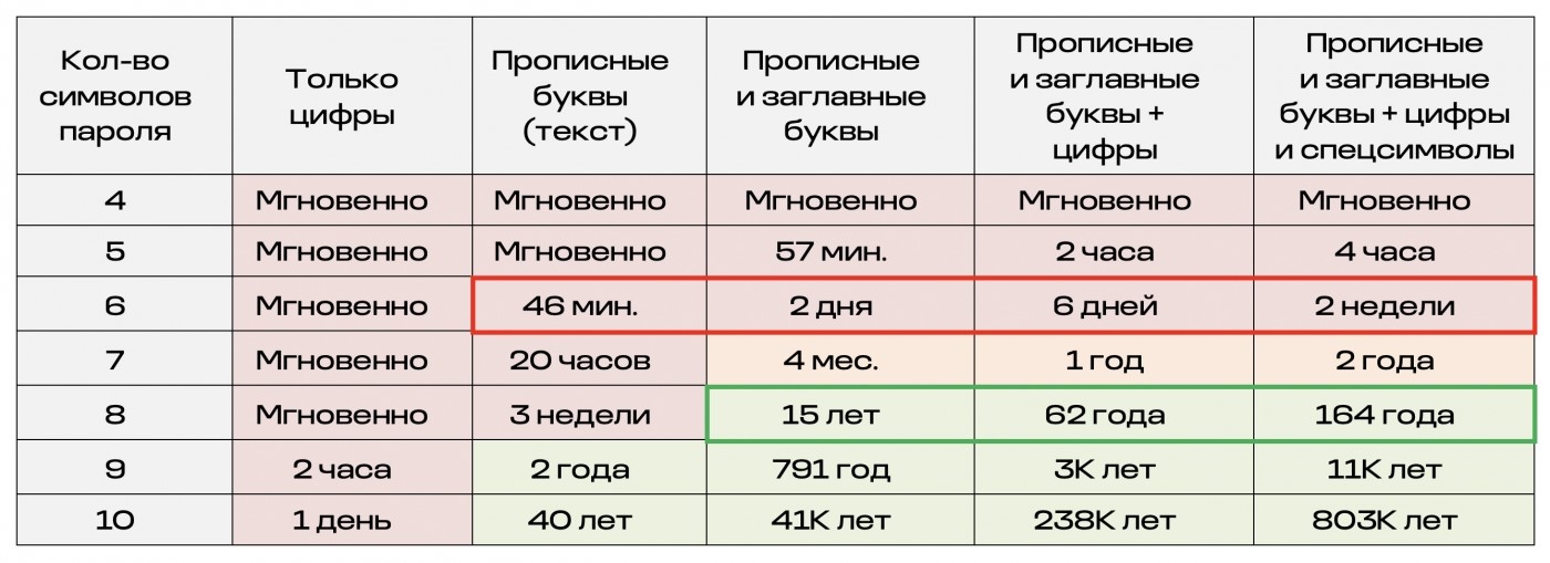 Восьмисимвольный пароль с использованием прописных, заглавных букв, цифр и спецсимволов ломается за пять часов.