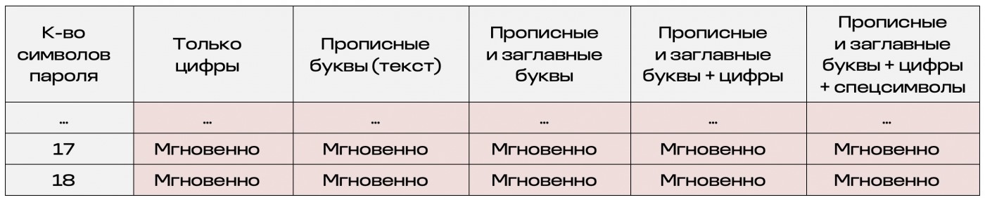 Из таблицы видно, что использование пароля менее восьми символов, набранного без использования цифр и/или служебных символов недопустимо. Таким образом, действующие требования к паролю для ИС 4-го класса защищённости безнадёжно устарели в случае, если имеется возможность машинного перебора.