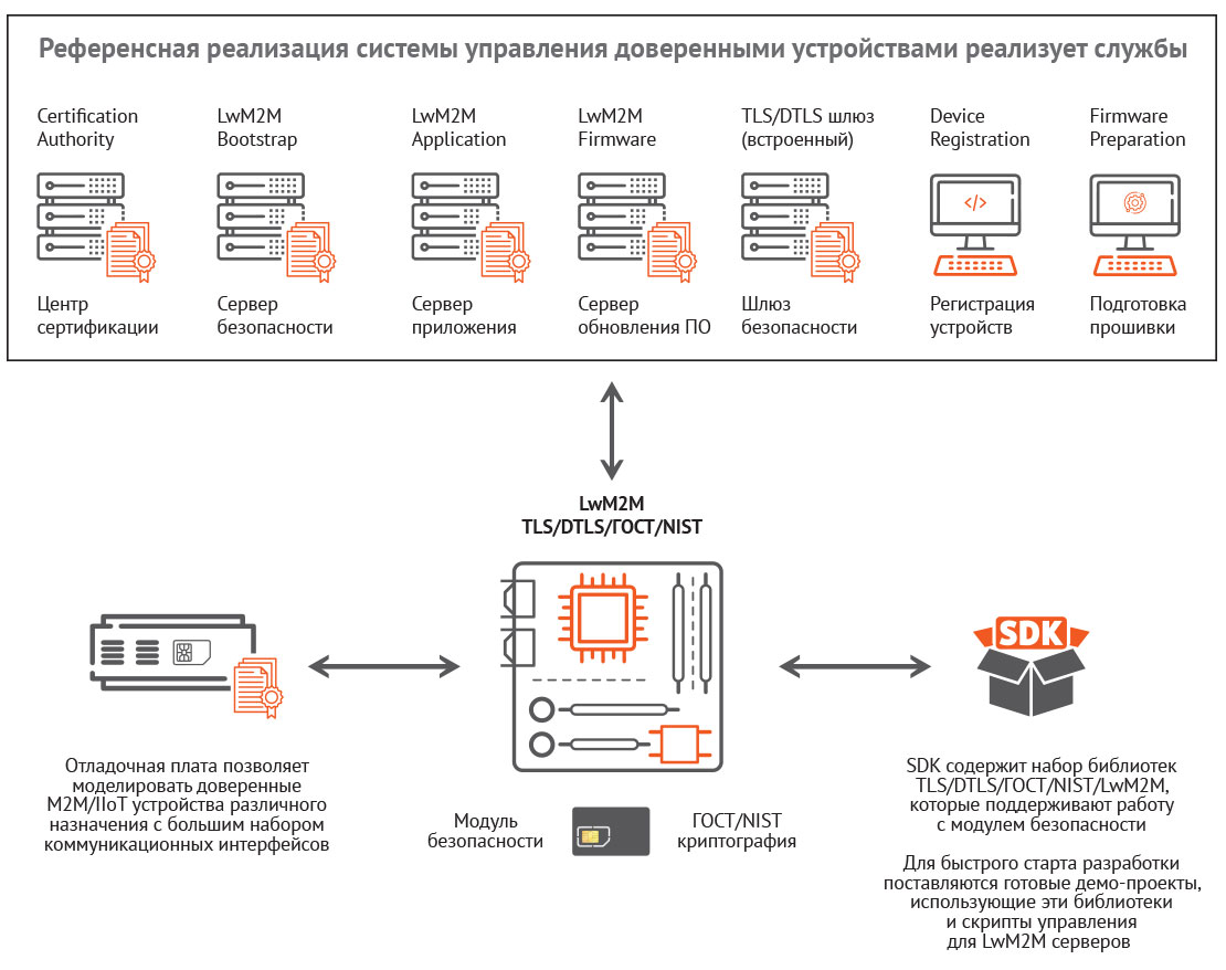 - Выполнять доверенное обновление встроенного программного обеспечения LwM2M устройств