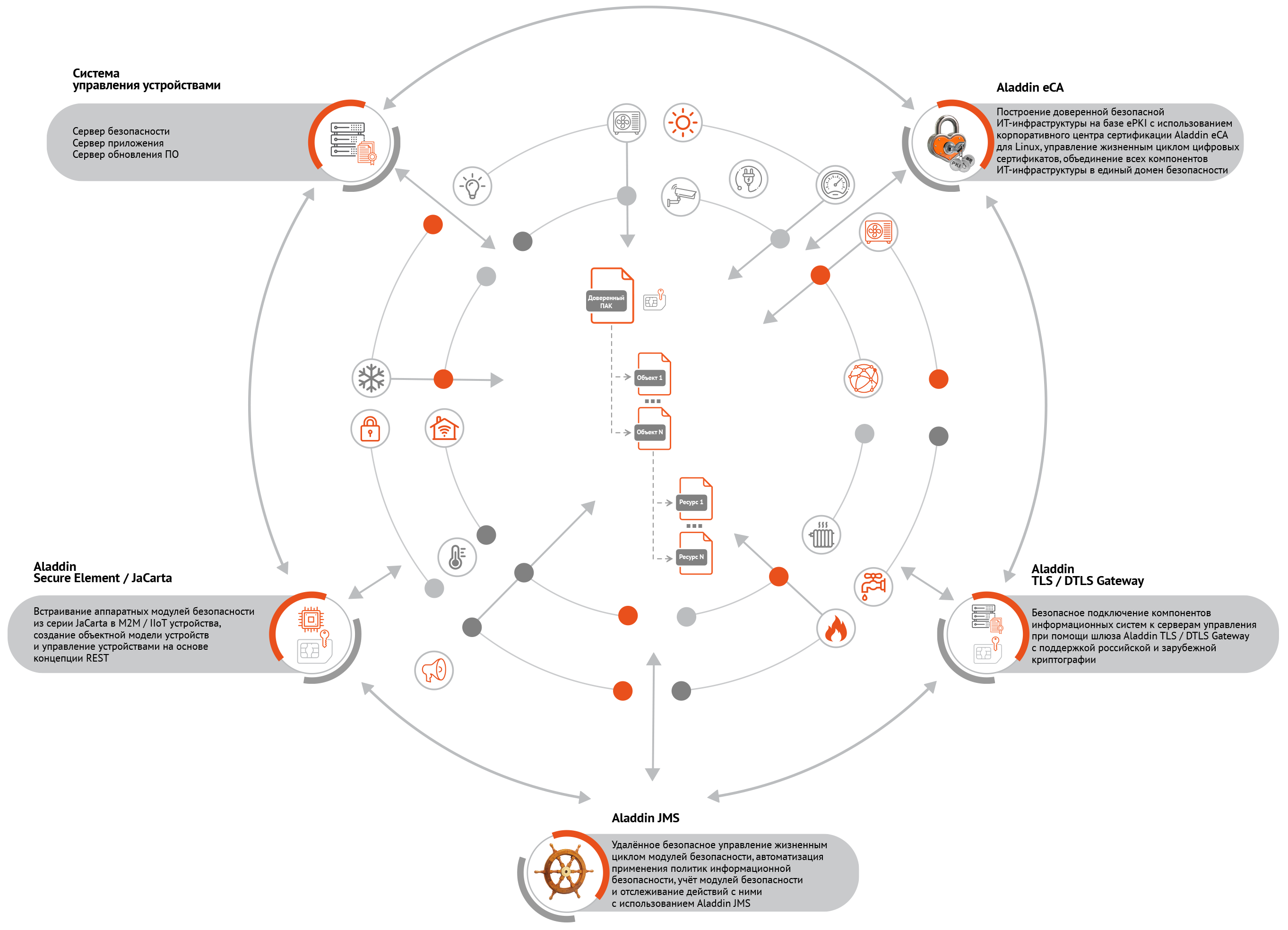 - Встраивание сертифицированных модулей безопасности Aladdin Secure Element для защиты каналов передачи данных, безопасного хранения ключей, сертификатов, паролей и другой чувствительной информации