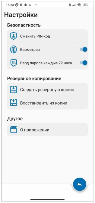 - Уведомление о вводе пин-кода для входа в приложение каждые 72 часа (опционально)