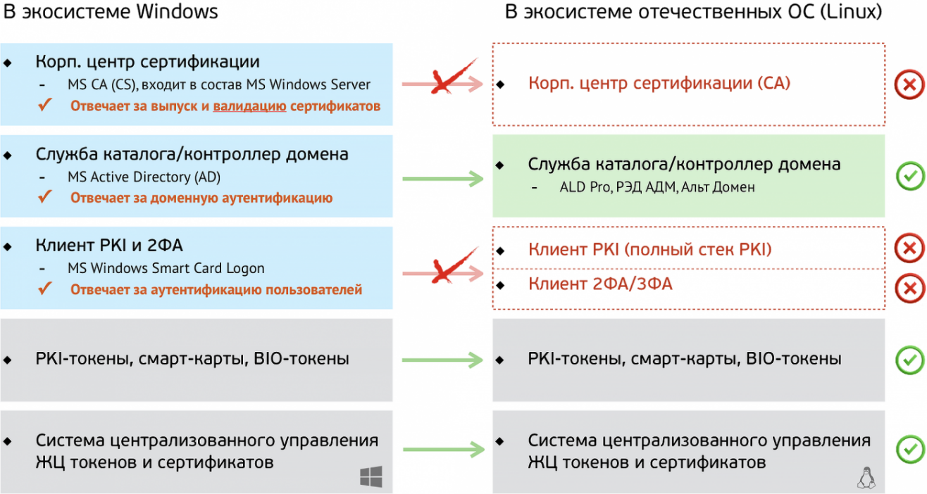 - В Linux (и всех российских ОС на базе Linux) штатной поддержки PKI и средств 2ФА/3ФА нет.