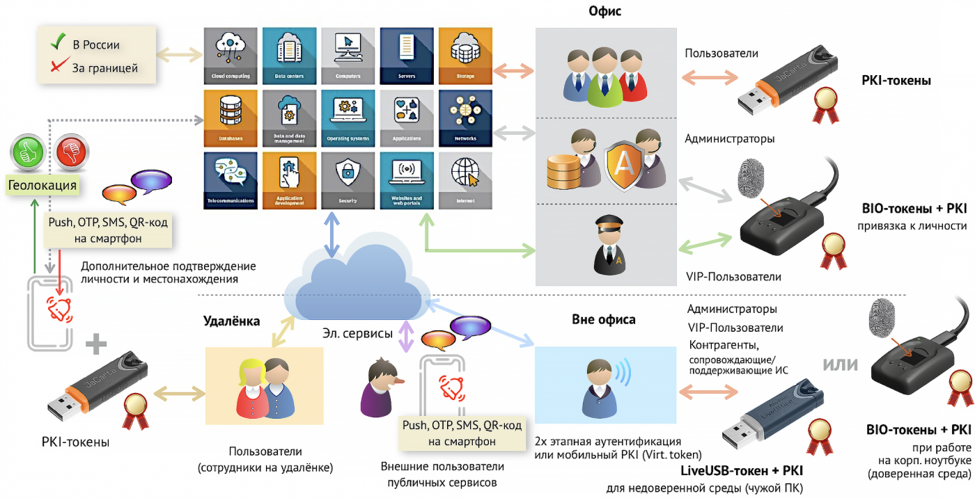 Чтобы получить геолокацию, понадобится зарегистрированный в ИС номер мобильного телефона такого сотрудника и дополнительные средства, обеспечивающие дополнительную (усиленную) аутентификацию с отправкой на него push, SMS, ОТР сообщений и обработку данных геолокации по базовым станциям (увы, GPS/ГЛОНАСС теперь могут увести далеко не туда). И это в дополнение к его штатному USB-токену. Телефон нужен как «второй» фактор с возможностью получения геолокации, позволяющий осуществлять блокирование доступа из-за границы.