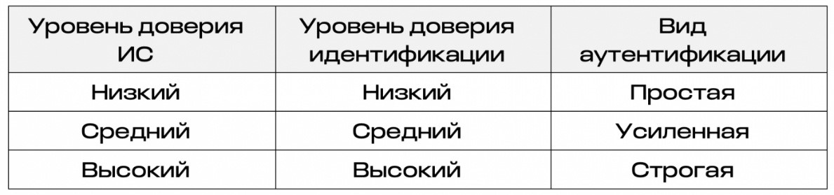Уровень доверия ИС определяется достигнутым уровнем доверия идентификации и аутентификации и не может быть выше него. При этом определяющим является используемый вид аутентификации.