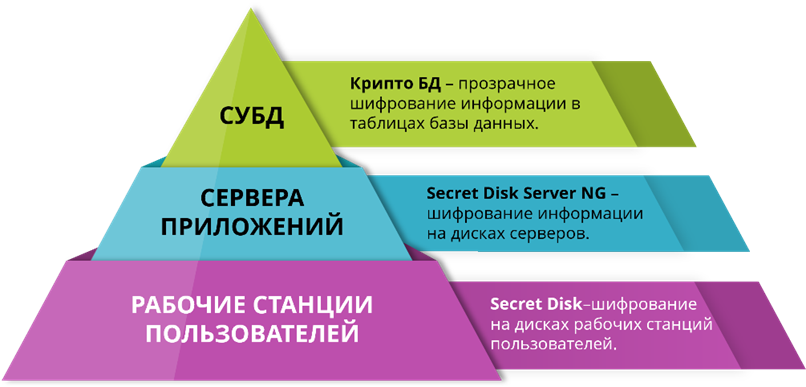 Secret Disk специализированный продукт, фокусированный на конкретной задаче. Он обладает широким набором механизмов шифрования и обеспечивает безопасность данных от утечки на всех логических уровнях: